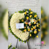 CORONA EN PARANTE DE FIERRO, ROSAS, MONTECASINO, LILIUM, GRACENIA, PALMERA. POMPONES Y FOLLAJE FINO.