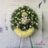 CORONA FUNEBRE EN PARANTE DE FIERO, ROSAS, POMPONES, GLADIOLO, LILIUM, PALMERA, CARTUCHO Y FOLLAJE FINO
