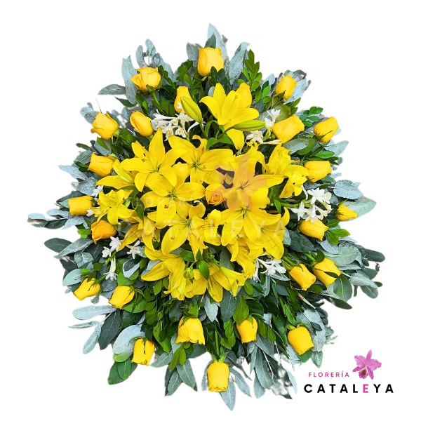 HERMOSA LAGRIMA FÚNEBRE AMARILLA, LILIOS AMARILLOS, HORTENSIA, IRIS, FINA LLUVIA, HOJAS DE EUCALIPTO Y PALMEAS.